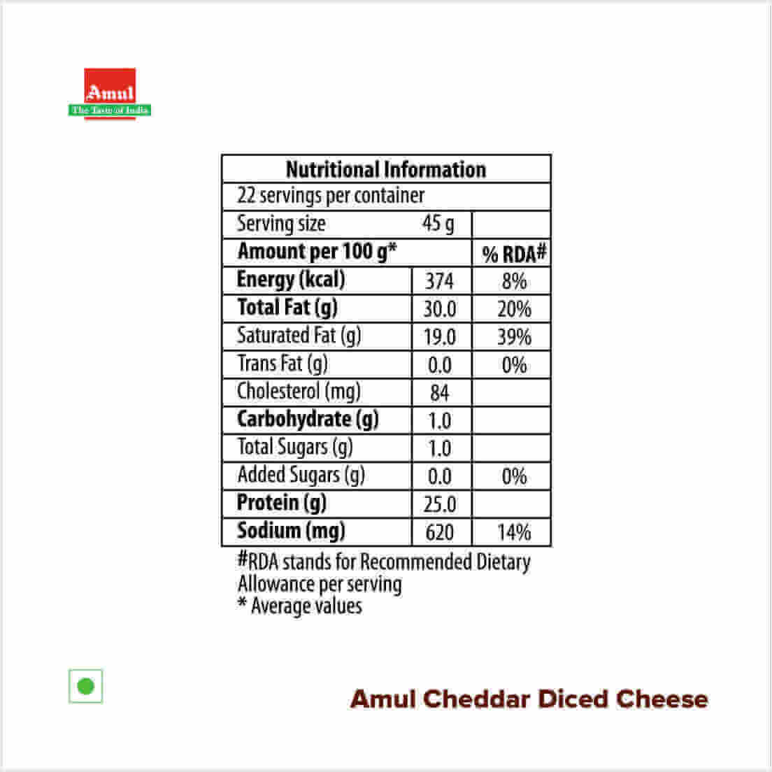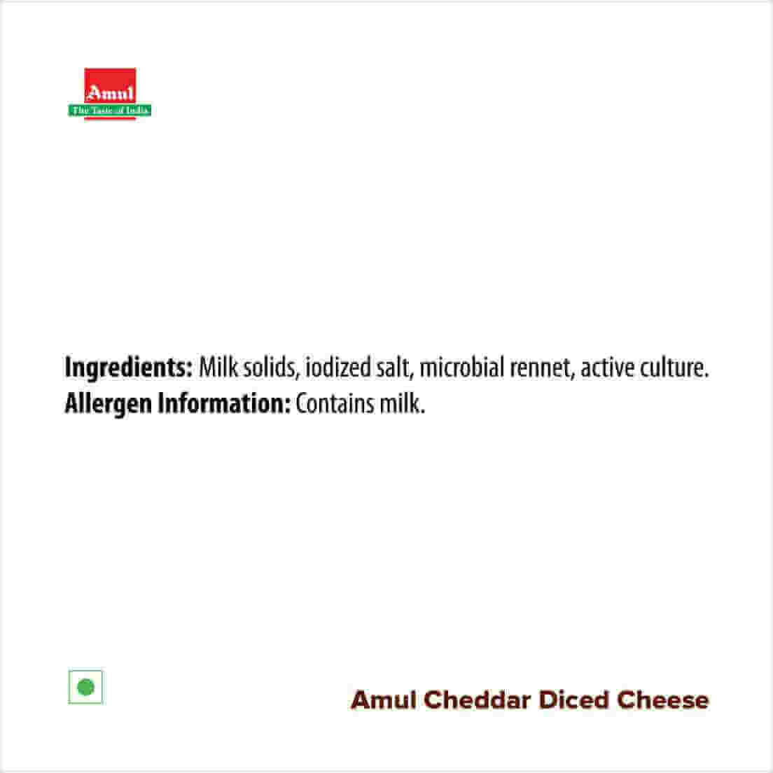 Amul Diced Mozzarella has a moist, soft, elastic texture and has a distinctive mild salty taste and a pleasant aroma. Due to its elastic and stringy texture, this cheese is ideal for preparing Lasagna, and as a topping on pizzas. When baked with pizzas, it melts uniformly while beautifully engulfing all other ingredients of the pizza surface. Mozzarella Cheese is also an excellent source of milk proteins.