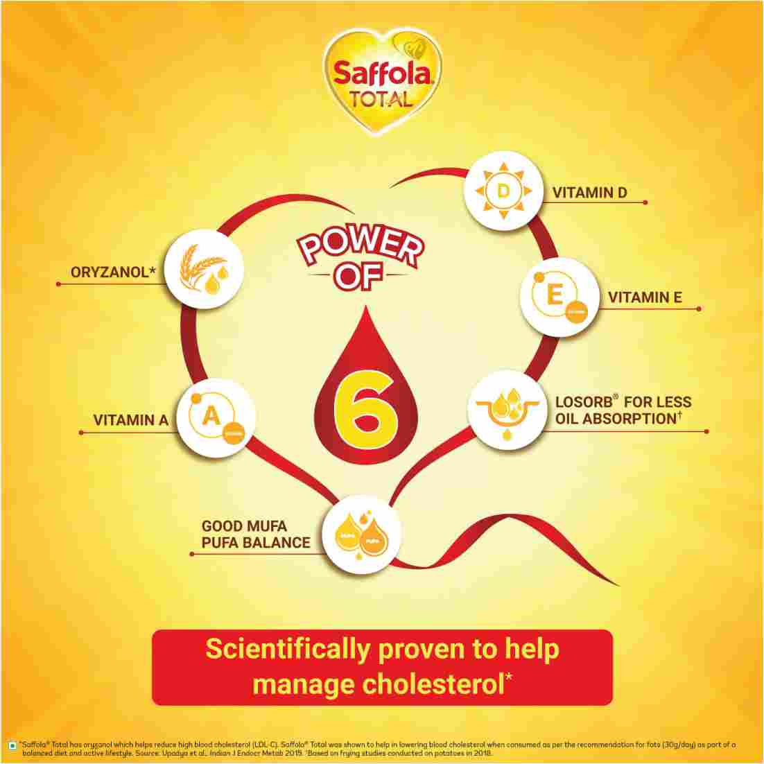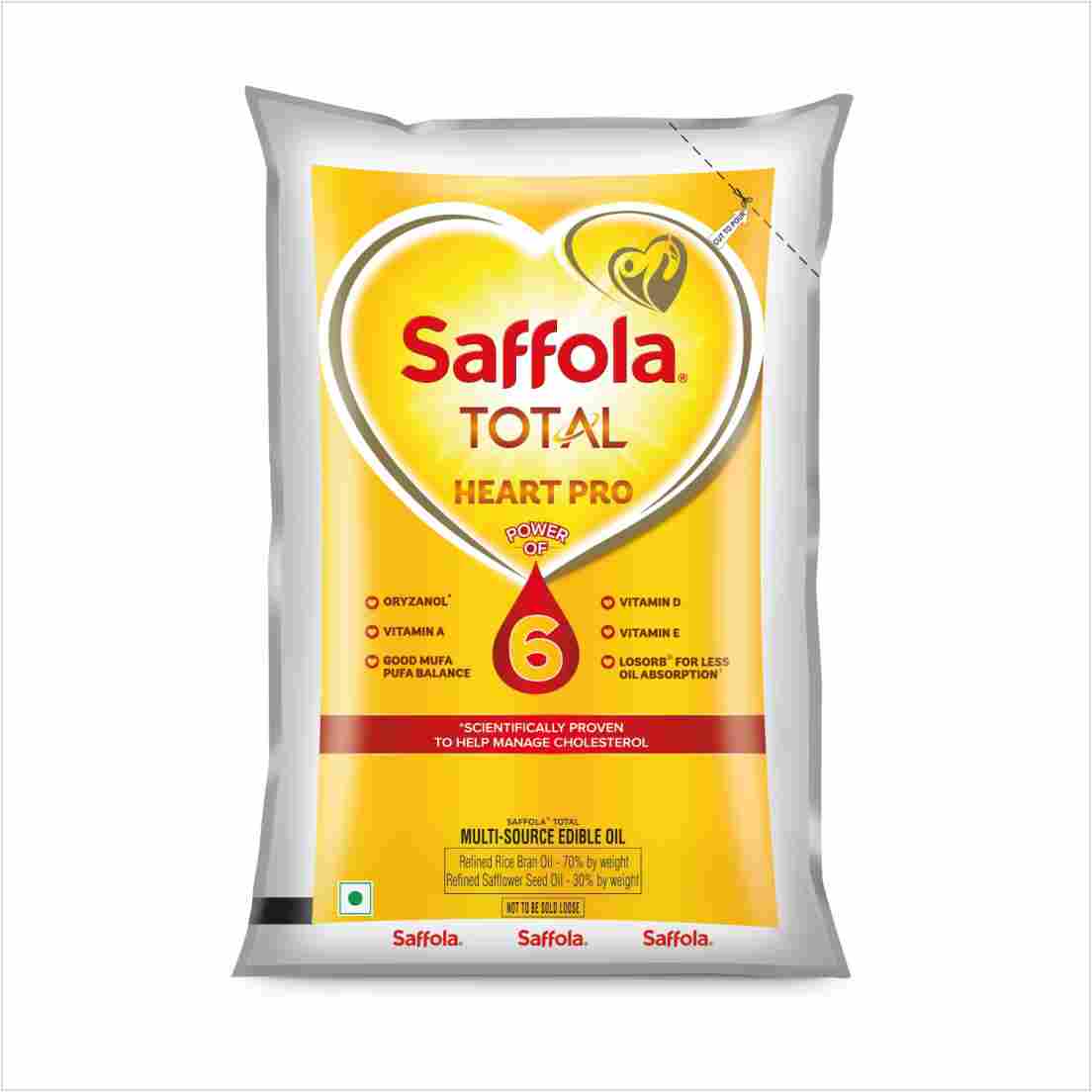 Saffola Total multisource edible oil is clinically tested to take care of your heart in not just 1 but 8 ways. Saffola Total multisource edible vegetable oil has an advanced antioxidant system that helps improve immunity. Saffola Total has Oryzanol which helps maintain healthy cholesterol levels. Saffola Total cooking oil comes with LOSORB™ technology which ensures that your food absorbs up to 31% lesser oil. Choose Saffola Total, an expert solution that helps you take care of your heart!
