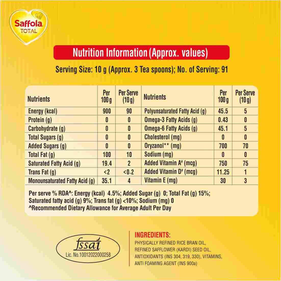 Physically Refined Rice Bran Oil & Refined Safflower (Kardi) Seed Oil Contains Permitted Antioxidants [306, 304, 319, 330] and Anti Foaming Agent [900a] Free From Argemone Oil. Contains Vitamins E: 900 Ppm Fortified With Vitamins A And D.