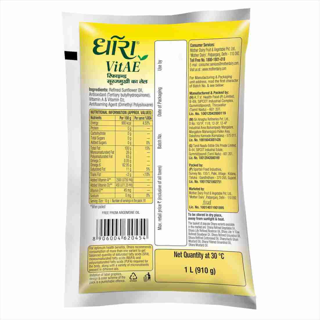 Ingredients – Refined Sunflower Oil Antioxidant Tertiary butylhydroquinone), Vitamin A & Vitamin D2 Antifoaming Agent (Dimethyl Polysiloxane)