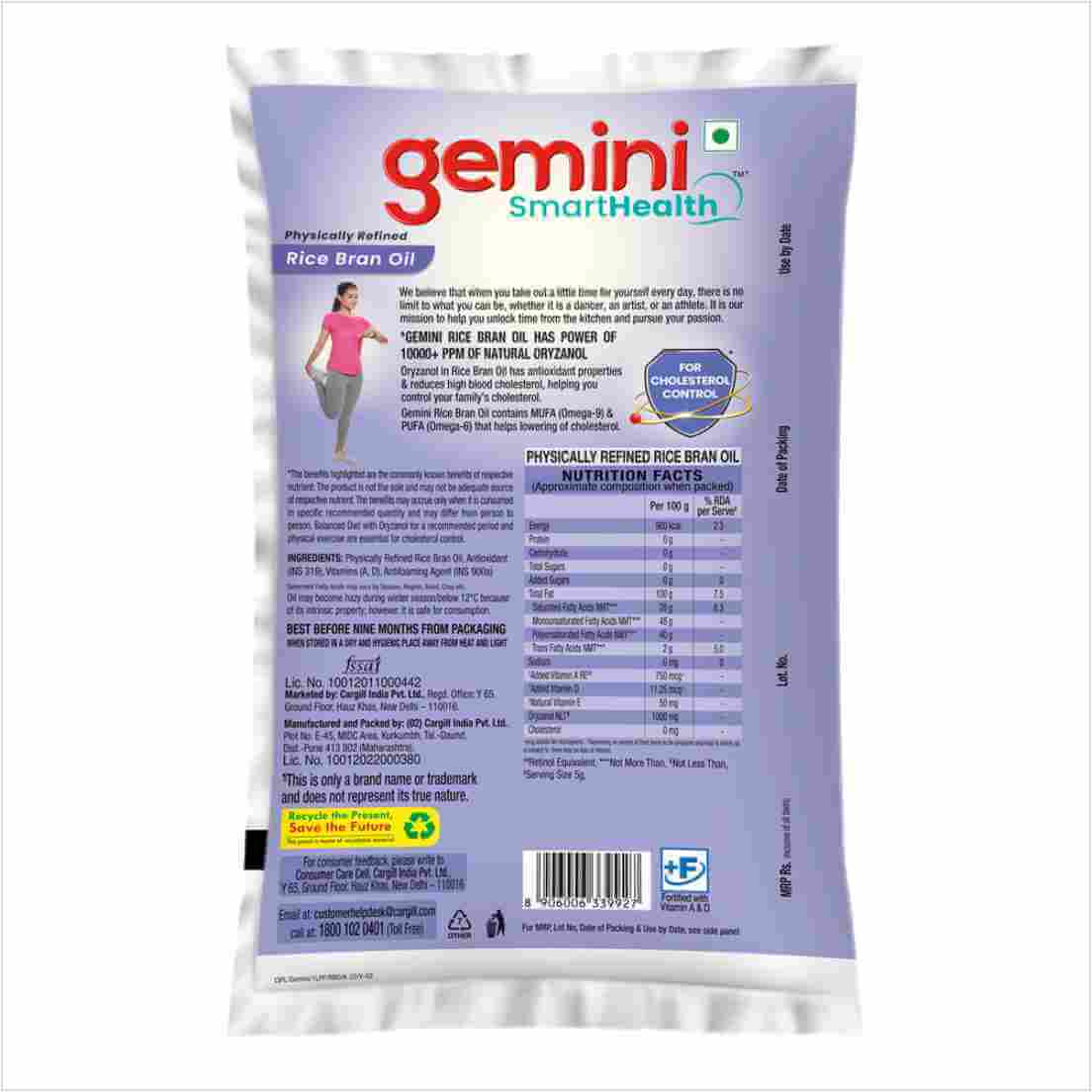 Gemini Refined Rice Bran Oil comes with Nutri Fresh Lock Technology, which ensures food cooked in it retains added nutrients and freshness for a long time. Your favorite Gemini Refined Rice Bran Oil now comes with Nutri Fresh Lock Technology which means it goes through select processes with continuous monitoring and then it is hygienically packed in recyclable packaging material having barrier properties which ensure that food cooked in Gemini Refined Rice Bran Oil retains added nutrients and freshness for a long time. Gemini Refined Rice Bran Oil comes with the goodness of Vitamins A, D & E.