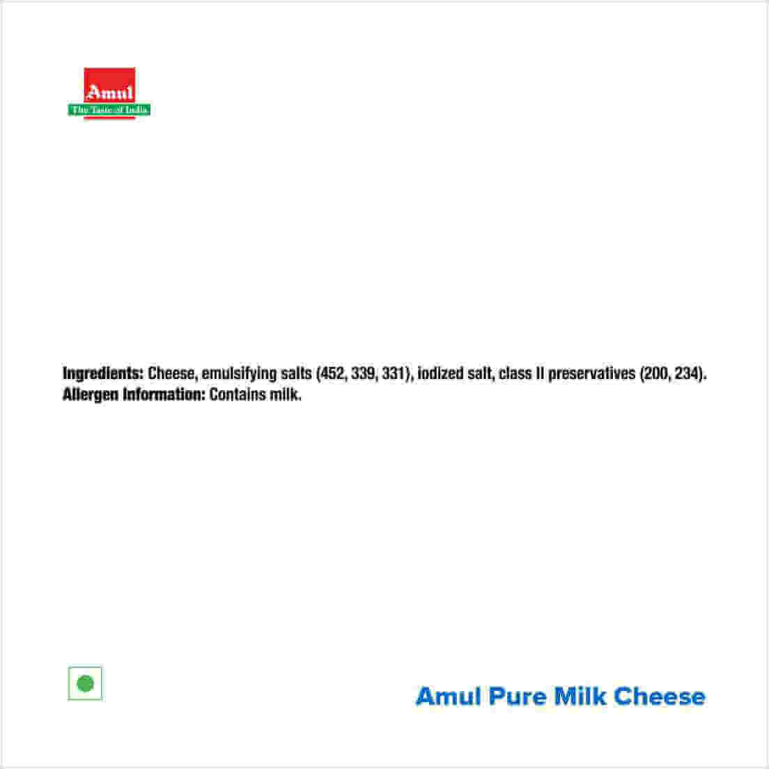 Ingredients: Cheese, Sodium Citrate, Common Salt, Citric Acid, permitted natural color – Annatto, Emulsifier and Class II preservatives.