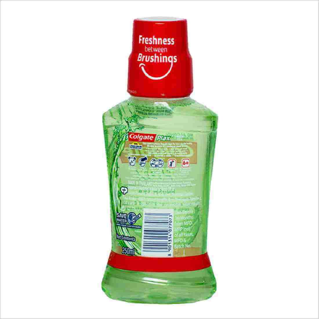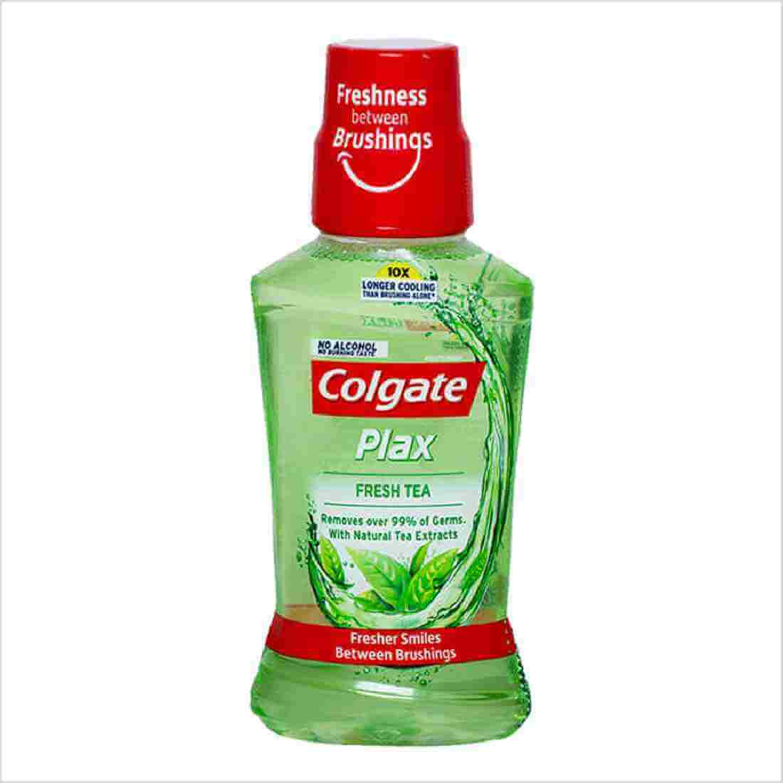 Colgate Plax Fresh Tea mouthwash removes over 99% of germs that cause bad breath and cavities, giving you a fresher and cleaner mouth than brushing alone. It contains natural tea extracts that provide a refreshingly pleasant aroma. This mouthwash is alcohol-free, ensuring no burning sensation upon use, yet it instantly eliminates 99% of germs. Experience an instant blast of freshness and a 10x longer cooling sensation compared to brushing alone, maintaining 24/7 control over bad breath with regular use.